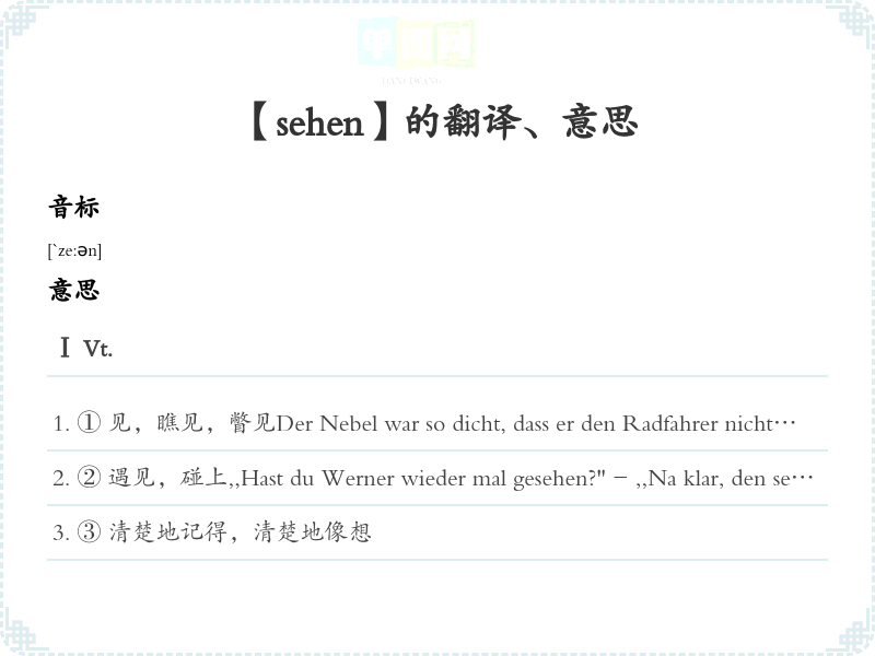 ① 见,瞧见,瞥见Der Nebel war so dicht, dass er den Radfahrer nicht rechtzeitig sah.雾很浓,使他没有及时见骑车人。Als er sie sah, ging er auf sie zu und umarmte sie.当他见她时,便走过去并拥抱她。Bei klarem Wetter kann man von hier aus die Berge sehen.要是晴天从这儿就能山。Hast du gesehen, wie wütend er war?你没有,他怎么发火来着?auf dem linken Auge nichts sehen用左眼什么都不见