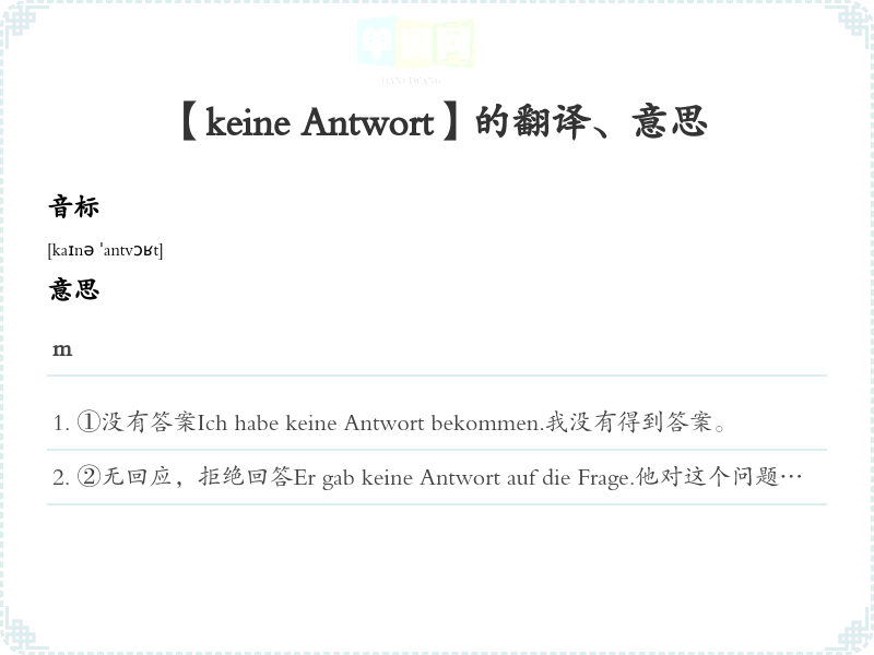 ②无回应,拒绝回答Er gab keine Antwort auf die Frage.他对这个问题没有回答。