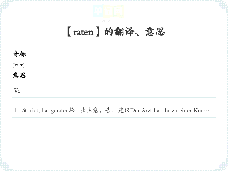 rät, riet, hat geraten给...出主意,告,建议Der Arzt hat ihr zu einer Kur geraten.医生曾建议她去疗养。Ich habe ihm geraten, neue Reifen zu kaufen.我曾他买新轮胎。Vträt, riet, hat geraten,(义词:schätzen)Ich habe keine Ahnung, wie viel du für das Auto gezahlt hast, aber lass mich mal raten.我不知道你买这车花了多少钱,让我看吧。Er hat die Antwort nur geraten.这个答案他只是蒙对了。语法搭配+四格, +三格, zu+三格