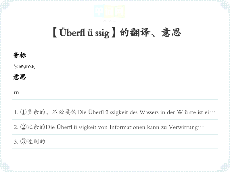 ①多余的,不必要的Die Überflüssigkeit des Wassers in der Wüste ist ein großes Problem.沙漠中水的多余是一个大问题。