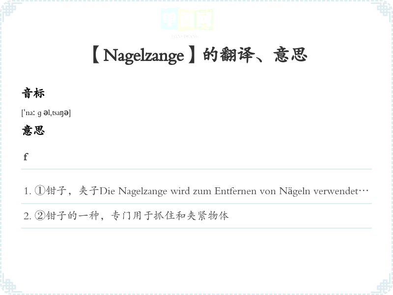 ①钳子,夹子Die Nagelzange wird zum Entfernen von Nägeln verwendet.钳子用于拔掉钉子。