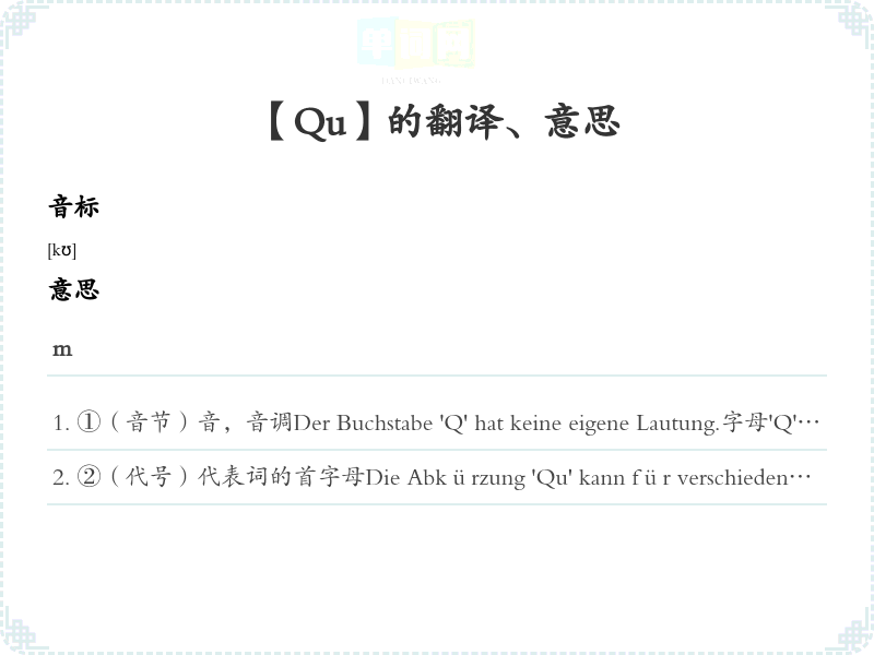 ②(代号)代表词的首字母Die Abkürzung 'Qu' kann für verschiedene Begriffe stehen.缩写'Qu'可以代表不同的术语。