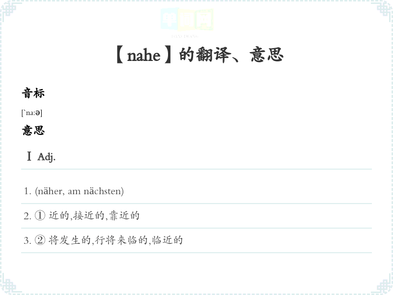 ③ 亲密的,密切的,亲近的Ⅱ Präp.<支配第三格>傍,在...近旁支配第三格>