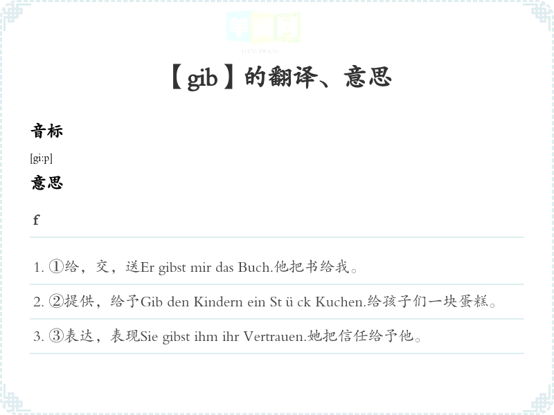 ②提供,给予Gib den Kindern ein Stück Kuchen.给孩子们一块蛋糕。