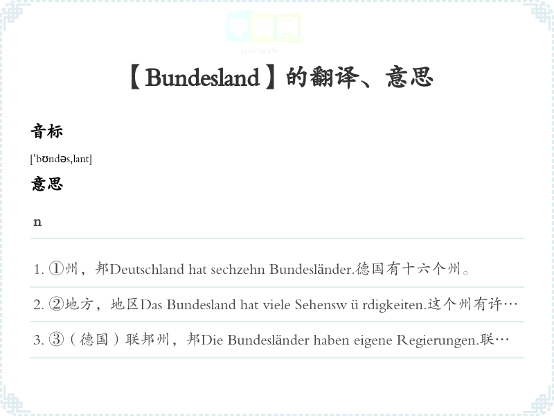 ②地方,地区Das Bundesland hat viele Sehenswürdigkeiten.这个州有许多名胜古迹。