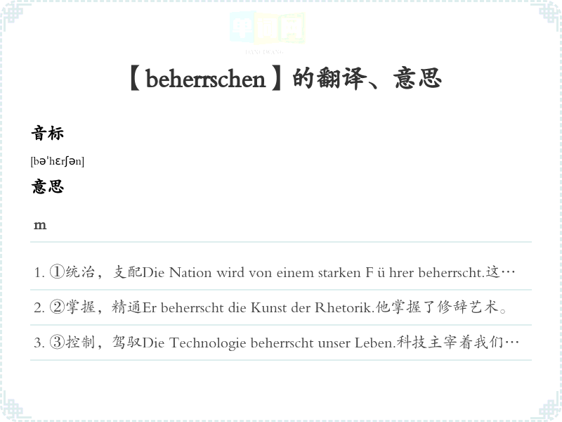 ①统治,支配Die Nation wird von einem starken Führer beherrscht.这个国家由一个强大的领导者统治。