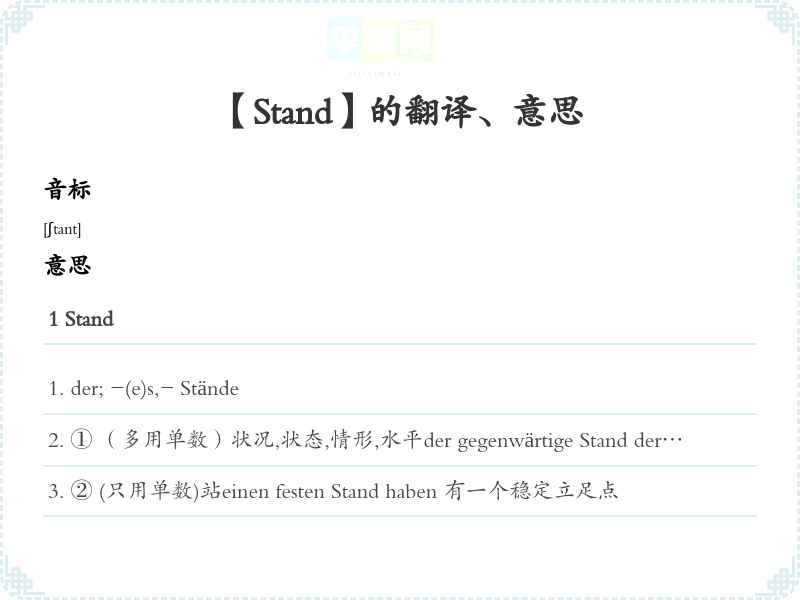 ① (多用单数)状况,状态,情形,水平der gegenwärtige Stand der Verhandlungen目前谈判状况Das Spiel wurde beim Stand (= Ergebnis) von 1:2 abgebrochen.比赛在1:2情况下中止。