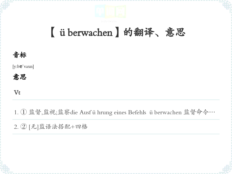 ① 监督,监视;监察die Ausführung eines Befehls überwachen 监督命令的执行den Produktionsablauf überwachen 注意观察生产过程j-n heimlich überwachen 秘密监视某人Der Häftling wurde von nun an strenger überwacht. 犯人从现在起被监视得更严了。