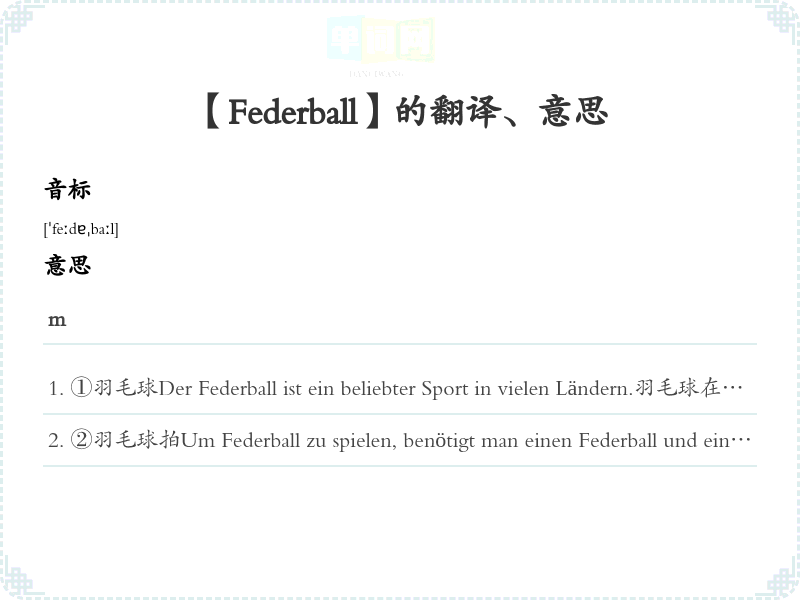 ①羽毛球Der Federball ist ein beliebter Sport in vielen Ländern.羽毛球在许多国家是一项受欢迎的运动。