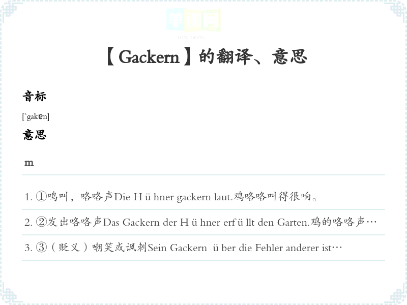 ①鸣叫,咯咯声Die Hühner gackern laut.鸡咯咯叫得很响。