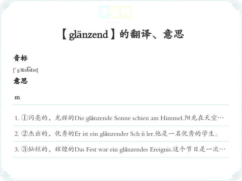 ①闪亮的,光辉的Die glänzende Sonne schien am Himmel.阳光在天空中闪耀。