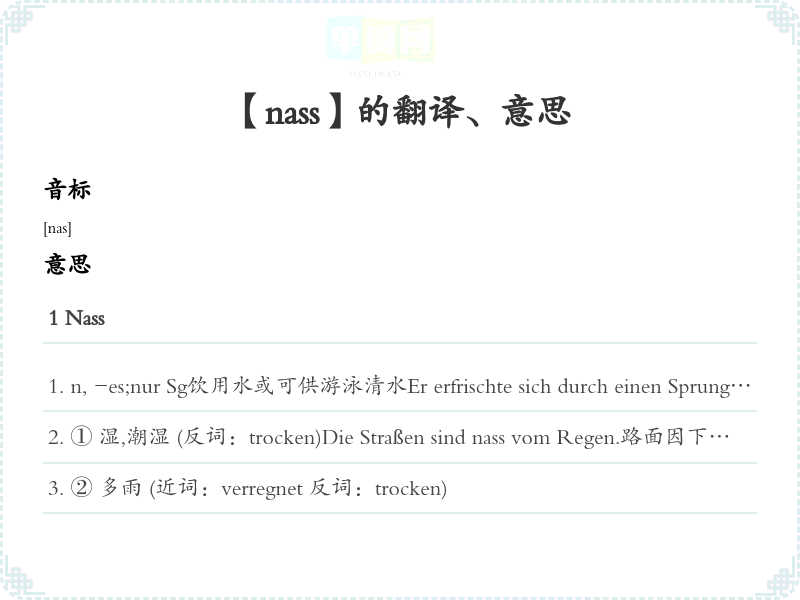 ① 湿,潮湿 (反词:trocken)Die Straßen sind nass vom Regen.路面因下雨而湿漉漉。