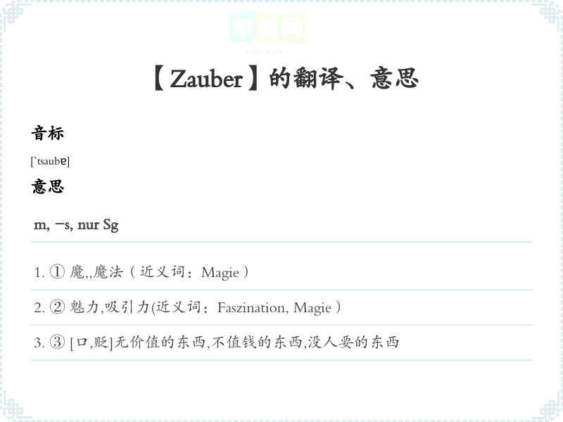 ② 魅力,吸引力(近义词:Faszination, Magie)