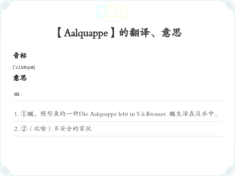 ①鱱,鳗形鱼的一种Die Aalquappe lebt in Süßwasser. 鱱生活在淡水中。