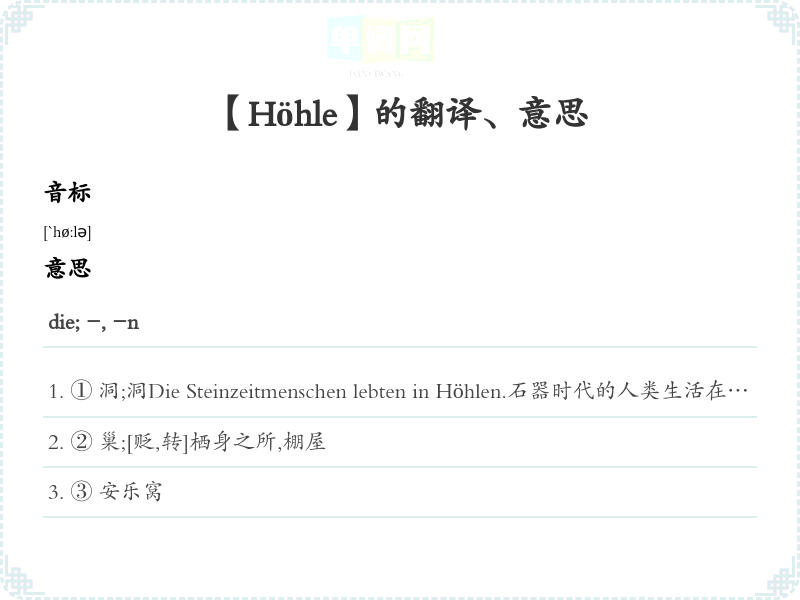 ① 洞;洞Die Steinzeitmenschen lebten in Höhlen.石器时代的人类生活在洞里。