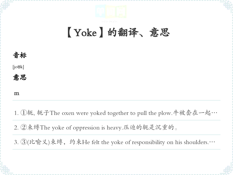 ②束缚The yoke of oppression is heavy.压迫的轭是沉重的。
