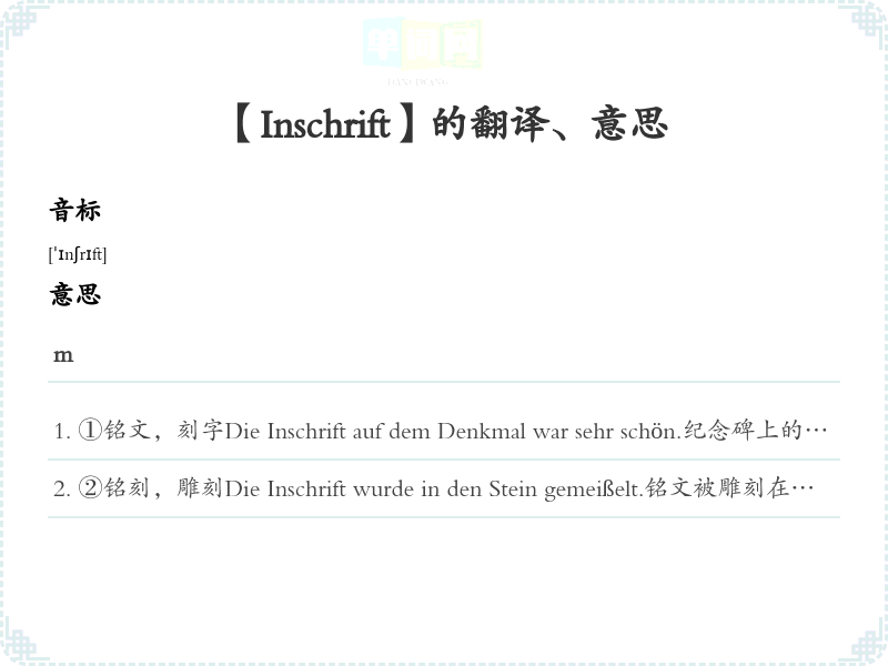 ①铭文,刻字Die Inschrift auf dem Denkmal war sehr schön.纪念碑上的铭文非常美。