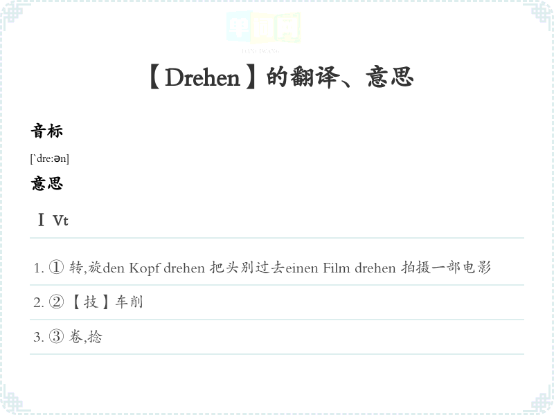 ③ 围绕着,关系到,涉及到...Die Erde dreht sich um die Sonne. 地球绕着太阳转。Ⅳdrehend P.Ⅰ