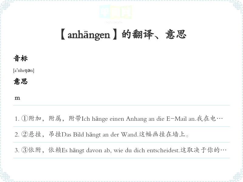 ①附加,附属,附带Ich hänge einen Anhang an die E-Mail an.我在电子邮件中附加了一个附件。