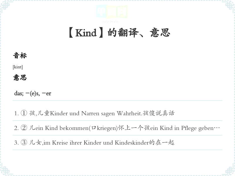 ① 孩,儿童Kinder und Narren sagen Wahrheit.孩傻说真话