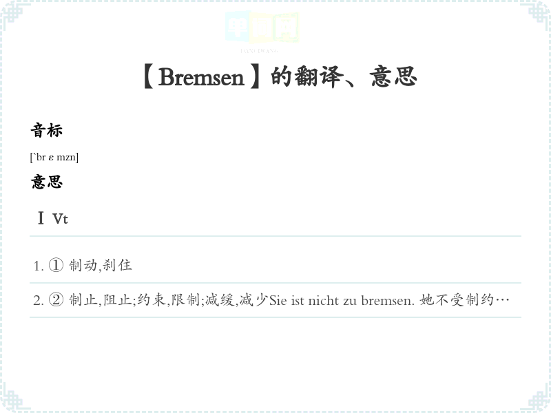 ② 制止,阻止;约束,限制;减缓,减少Sie ist nicht zu bremsen. 她不受制约。Ich kann/werd mich bremsen![口]不可能!没戏!Ⅱ Vi制动,刹语法搭配sich+四格, +四格, in+三格
