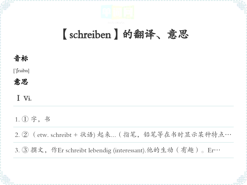 ③ 撰文,作Er schreibt lebendig (interessant).他的生动(有趣)。Er schreibt in einer Sprache, die jeder versteht.他用一种通俗易懂的语言作。Er schreibt schon seit Jahren an seiner Doktorarbeit.几年来他一直在他的博士论文。