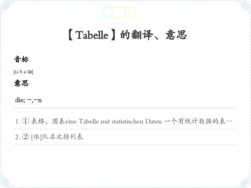 ① 表格,图表eine Tabelle mit statistischen Daten 一个有统计数据的表格eine Tabelle anfertigen, aufstellen 制表,列表etw. in eine Tabelle eintragen 把某事登记入表etw. steht in einer Tabelle 某事在表上记着