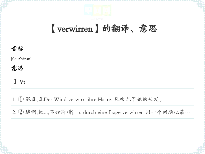 ② 迷惘,把...,不知所措j-n. durch eine Frage verwirren 用一个问题把某人搞Ⅱ Vr被乱;得乱七八糟Sein Haar hat sich verwirrt. 他的头发乱了。Ⅲ verwirrend (P.Ⅰ)混乱的,纷乱的,令人眼花缭乱的Ⅳ verwirrt (P.Ⅱ)迷惘的,困惑的,的ein verwirrter Blick 迷茫的目光语法搭配sich+格, +格