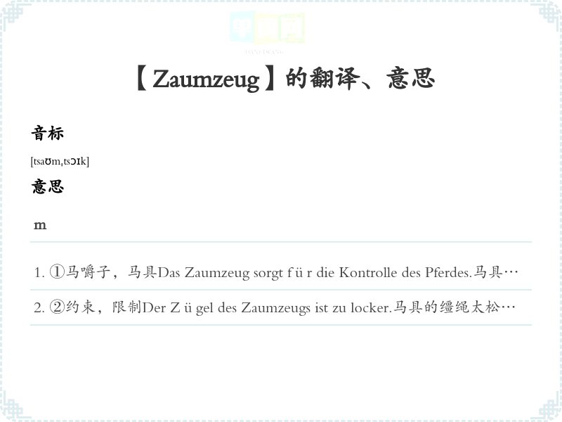 ①马嚼子,马具Das Zaumzeug sorgt für die Kontrolle des Pferdes.马具能控制马的行动。