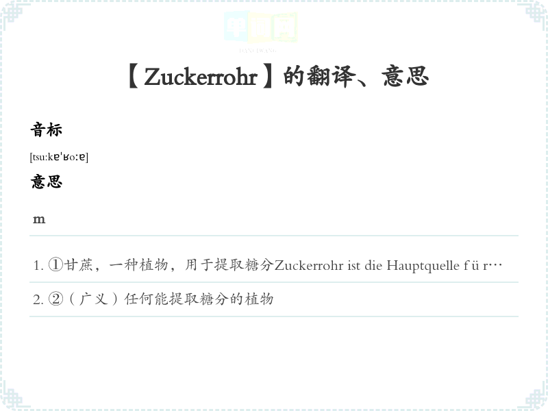 ①甘蔗,一种植物,用于提取糖分Zuckerrohr ist die Hauptquelle für Zucker.甘蔗是糖的主要来源。