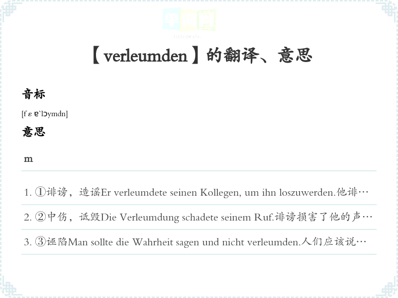 ①诽谤,造谣Er verleumdete seinen Kollegen, um ihn loszuwerden.他诽谤他的同事,以便让他离开。