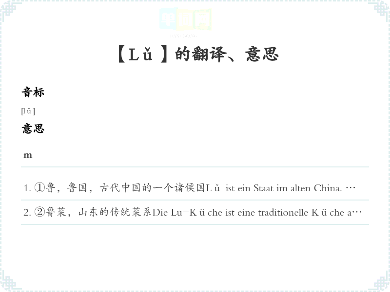 ①鲁,鲁国,古代中国的一个诸侯国Lǔ ist ein Staat im alten China. 魯是古代中国的一个国家。