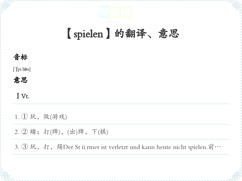 ③ <奥> 1)当儿戏 2)轻而易举地做 奥>Ⅳ spielend(P.Ⅰ) Ⅴgespielt(P.Ⅱ)语法搭配sich+四格, +四格, mit+三格, in+三格, neben+三格, in+四格, um+四格, auf+三格, gegen+四格, für+四格, an+三格, bei+三格