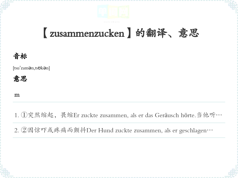 ①突然缩起,畏缩Er zuckte zusammen, als er das Geräusch hörte.当他听到声音时,他怔了一下。
