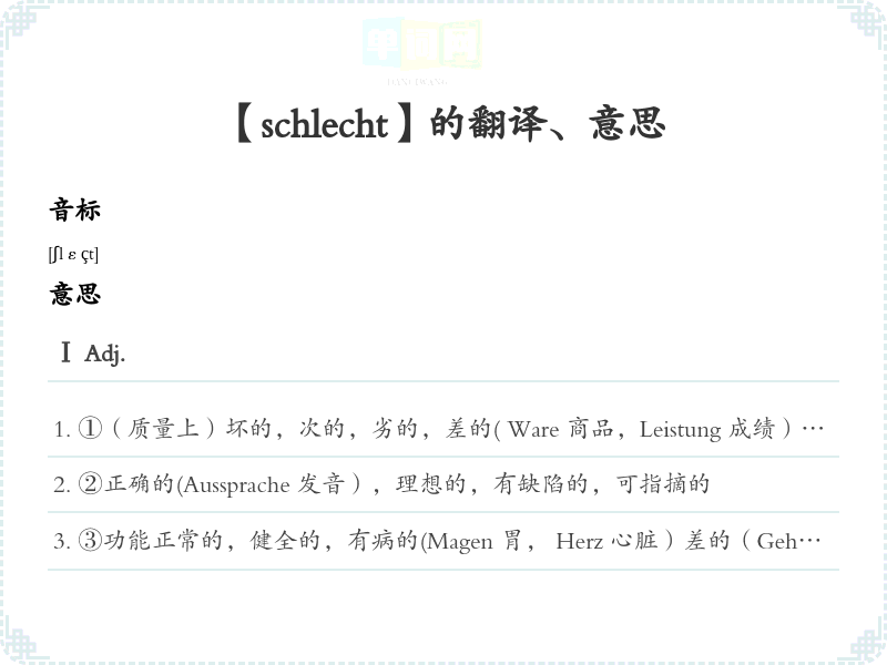 ⑪ 普普通通的,朴素的,简单的,Ⅱ Adv.很难,几乎能,容易Ich kann ihn doch schlecht darum bitten.为这事儿求他我真是感到为难。Das ist schlecht möglich.这大可能。