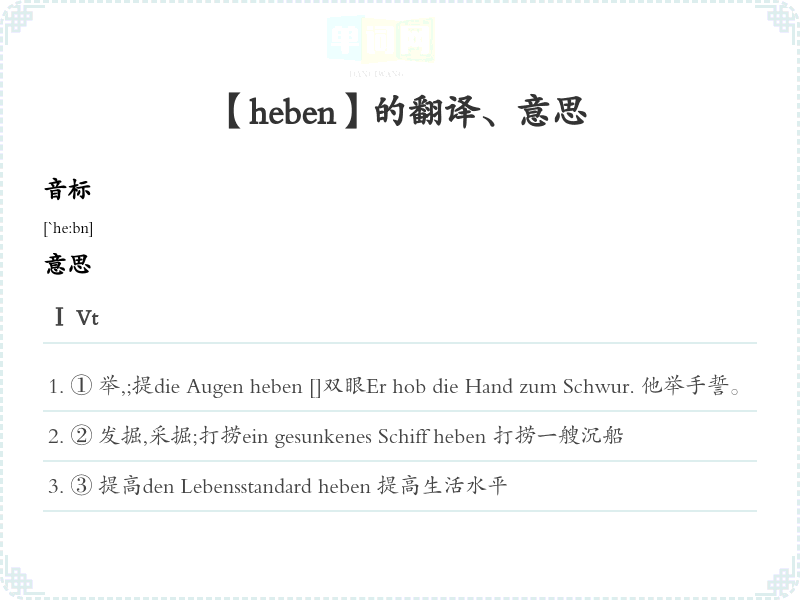 ⑤ [诗]开始Der Tag hebt sich. [诗]一天开始了。Ⅲ gehoben P.Ⅱ