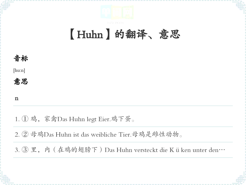 ② 母鸡Das Huhn ist das weibliche Tier.母鸡是雌性动物。