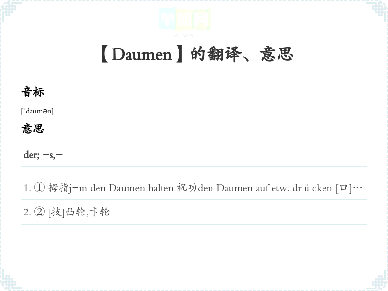 ① 拇指j-m den Daumen halten 祝功den Daumen auf etw. drücken [口]坚持事den Daumen rühren 付钱j-n über den Daumen drehen 欺骗j-n unter dem Daumen haben/unter den Daumen nehmen [口]用暴力控制,强制