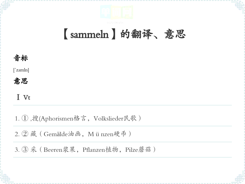 ② 中的,专心致志的,聚精会神的Er war sehr gesammelt. 他很专心。语法搭配+四格, sich+四格, für+四格