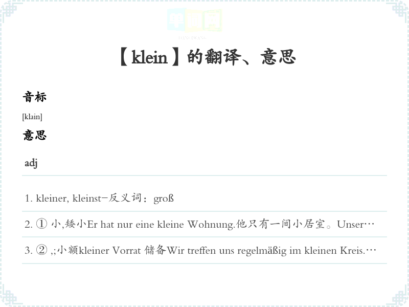 ① 小,矮小Er hat nur eine kleine Wohnung.他只有一间小居室。Unser Sohn ist so gewachsen, dass ihm alle seine Schuhe zu klein geworden sind.我们儿子长大了,他所有鞋子都太小了。