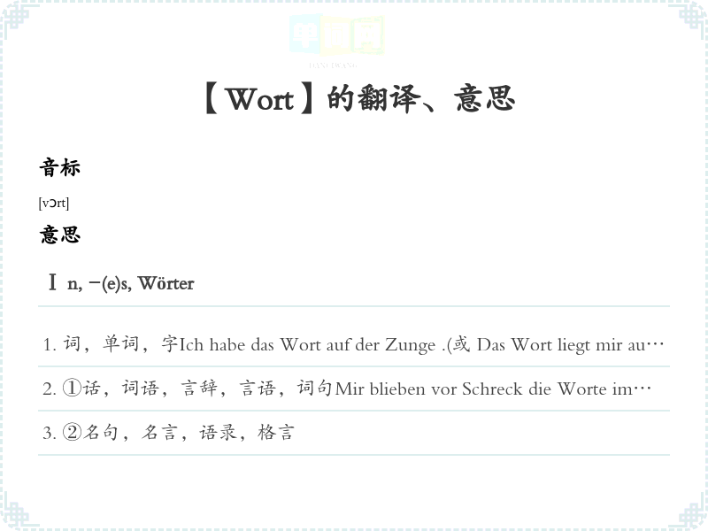 ①话,词语,言辞,言语,词句Mir blieben vor Schreck die Worte im Munde (或 im Halse, 或 in der Kehle) stecken.我吓得话都不出来了。Das sind nur schöne (或 leere) Worte.这只不过是些漂亮话(空话)。Das ist ein wahres Wort!这是实在话!(话全是事实)Ein Wort gab das andere.一言我一语争论起来。Auf ein Wort!我想和会儿话!Auf mein Wort!我担保!Er ist ein Mann von wenig Worten.他是一个沉默寡言人。Ein Mann, ein Wort.男子汉一言为定。