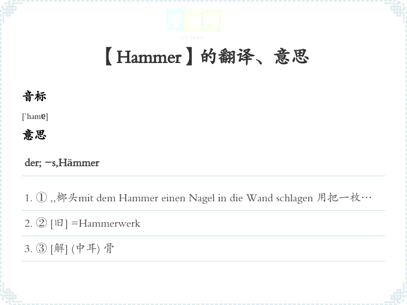① ,,榔头mit dem Hammer einen Nagel in die Wand schlagen 用把一枚钉钉进墙里etw.(A) unter den Hammer bringen 拍卖某物zwischen Hammer und Amboß geraten 左右为难,腹背受敌