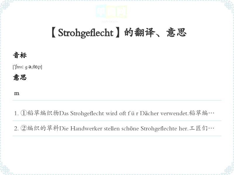 ②编织的草料Die Handwerker stellen schöne Strohgeflechte her.工匠们制作美丽的稻草编织物。