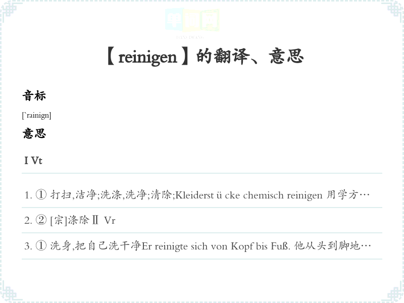 ① 打扫,洁净;洗涤,洗净;清除;Kleiderstücke chemisch reinigen 用学方法干洗衣服Abgase reinigen 净废气ein reinigendes Gewitter [转]一场澄清问题的争论