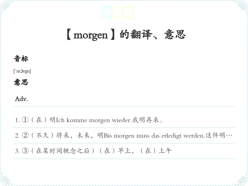 ②(不久)将来,未来,明Bis morgen muss das erledigt werden.这件明必须办完。Das sind eure Aufgaben für morgen.这是你们明任务。Das ist der Stil von morgen.这是未来风格。