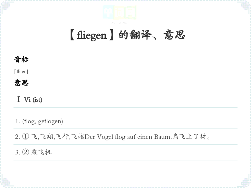 ① 飞,飞翔,飞行,飞越Der Vogel flog auf einen Baum.鸟飞上了树。