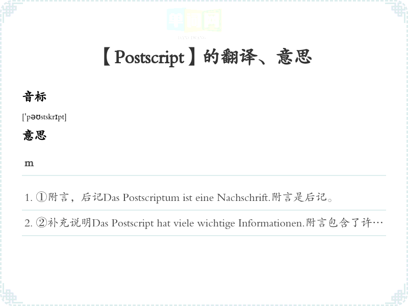 ②补充说明Das Postscript hat viele wichtige Informationen.附言包含了许多重要信息。