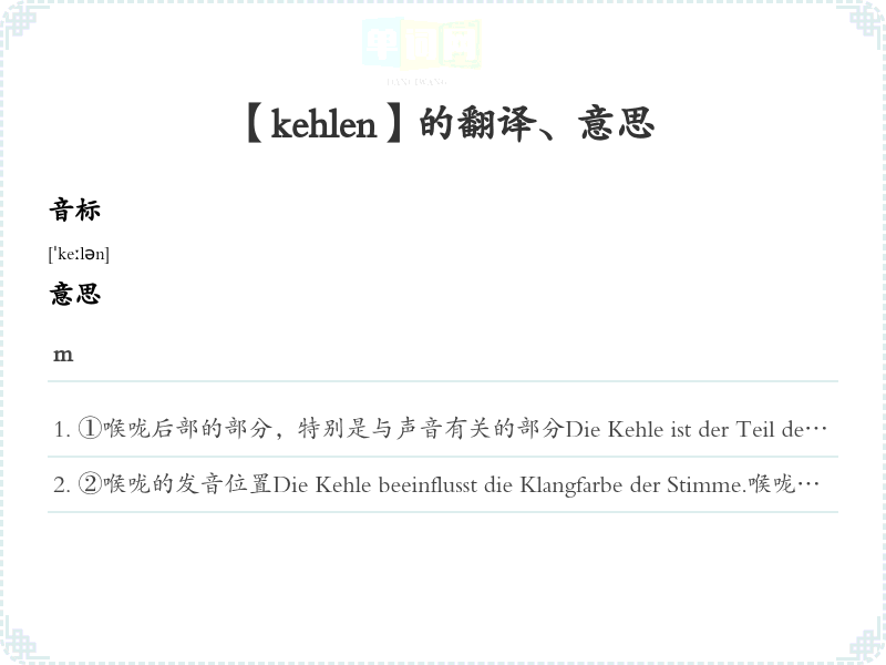 ①喉咙后部的部分,特别是与声音有关的部分Die Kehle ist der Teil des Halses, der das Geräusch erzeugt.喉咙是产生声音的部分。