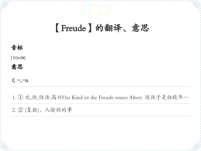 ① 欢,快,快活,高兴Das Kind ist die Freude seines Alters. 这孩子是他晚年的愉快。