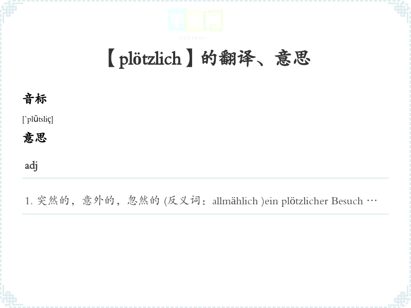 突然的,意外的,忽然的 (反义词:allmählich )ein plötzlicher Besuch 一个突如其来的访问Sein plötzlicher Entschluss, nach Amerika auszuwandern, hat uns alle sehr traurig gemacht.他突然决定移居美国,使我们很难过。Ich erschrak, als der Hund plötzlich zu bellen anfing.狗突然狂吠,我吓了一跳。